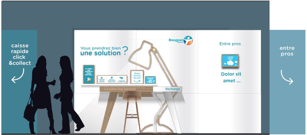 Afin d’assurer le déploiement optimisé du nouveau concept Bouygues Telecom dans toutes leurs boutiques françaises, nous avons travaillé sur la mise au point technique de tous les magasins et leur mobilier selon différentes typologies de boutique.