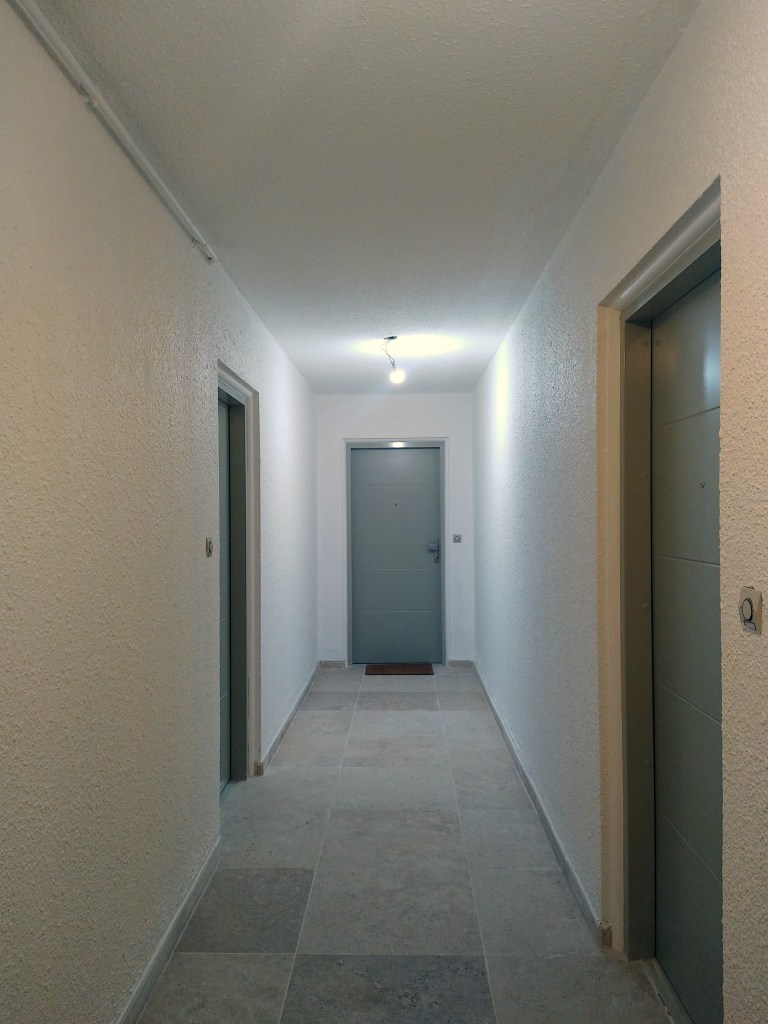 Les travaux aux abords comprennent l’entretien de la zone boisée située au nord, d’une dalle pour les terrasses et trottoir périphérique avec drain et la révision de la toiture. En façade, le remplacement de toutes les menuiseries ainsi qu’un ravalement sont réalisés. En intérieur, toutes les parties communes sont refaites à neuf. Les paliers existants sont divisés par l’ajout de 2 portes afin d’améliorer l’isolation acoustique des logements vis-à-vis des parties communes. Le remplacement de toutes les portes palières participe également à cette amélioration. Dans les logements, toutes les pièces d’eau sont refaites à neuf (sol, mur, plafond, équipements sanitaires). Les installations techniques (électricité, ventilation, plomberie) sont remplacées et mises aux normes.