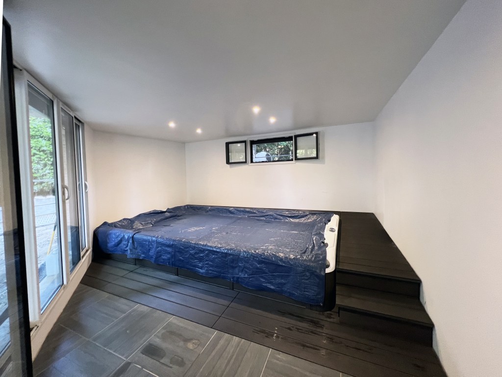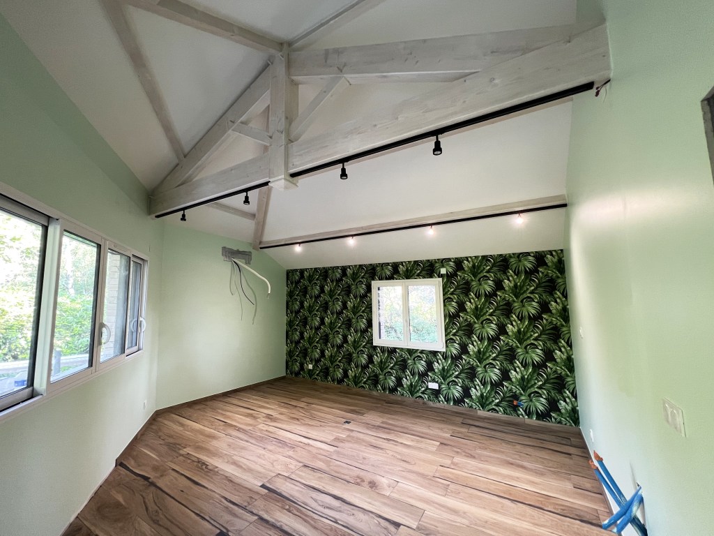 L’extension a été construite pour intégrer le spa et la pièce complémentaire à l’étage. Le défi de ce projet a été d’intégrer le spa au rez-de-chaussée de l’extension, avec toutes les contraintes techniques liées (étanchéité, gestion de l’humidité, livraison du spa avant la réalisation du plancher supérieur). A l’étage, un balcon en porte-à-faux a été créé dans la continuité du balcon existant.